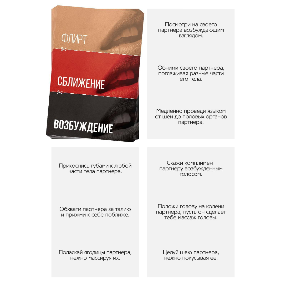 Разрежьте карточки по пунктирным линиям. У вас получится три колоды — розового, красного и бордового цвета. Начните с розовых — вытягивайте их по очереди и выполняйте задания. Затем переходите к красным, более жарким картам, и, наконец, к бордовым. Воплотите в жизнь эти идеи, и ваша ночь будет незабываемой...