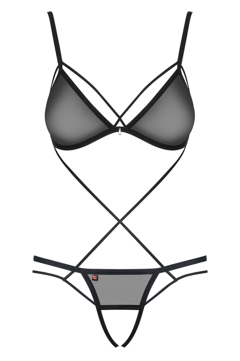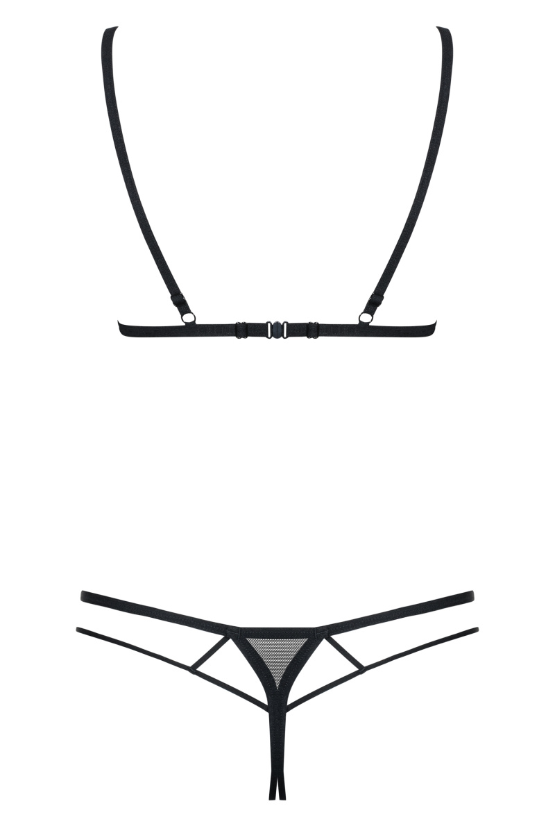 Детали: необычное сочетание - бюстгальтер, стринги и бретельки, облегающие тело, регулируемые бретели, регулируемая застежка на спине - идеальная посадка, уникальное украшение на бюстгальтере, стринги с открытой промежностью - гарантия незабываемых ощущений, деликатные эластичные ткани.