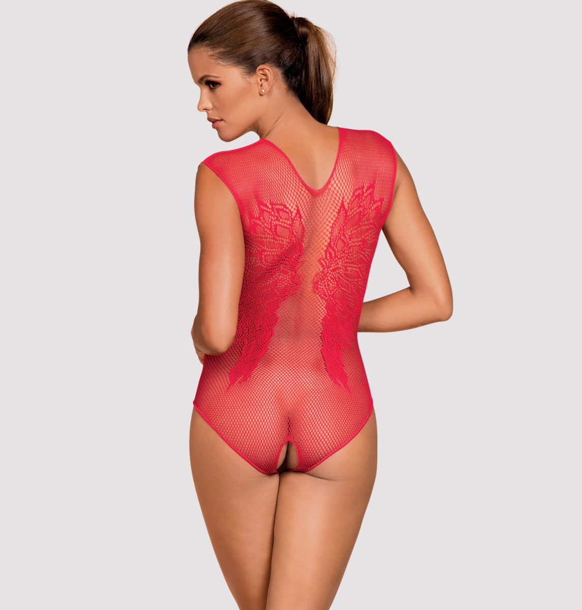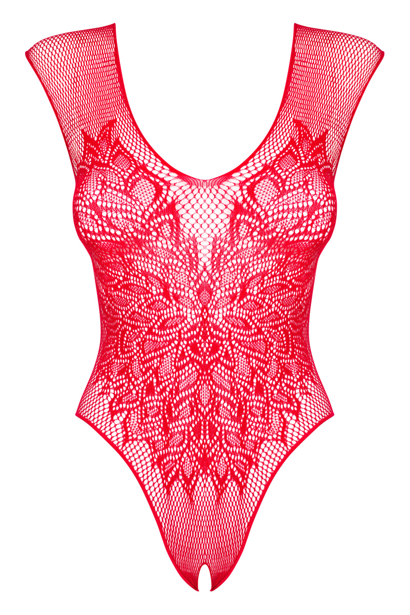 Детали: чувственная красная сетка - феноменально облегает тело, манящее глубокое декольте, интересные узоры спереди, мотив крыльев на спине, открытая промежность, мягкий, очень эластичный трикотаж.