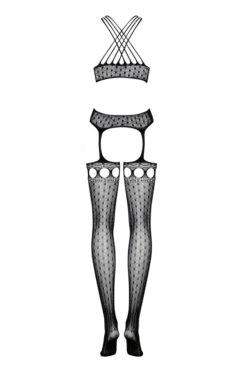 Cочетание топа и чулок соблазнительно обнажает ягодицы, вырез с перекрещенными полосками подчеркивает грудь, вертикальные вырезы на животе оптически сужают талию, вырезы на бедрах - дополнительное украшение, перекрещенные полоски на спине и крупный крой - подчеркнут женственные формы, мягкая и эластичная ткань.