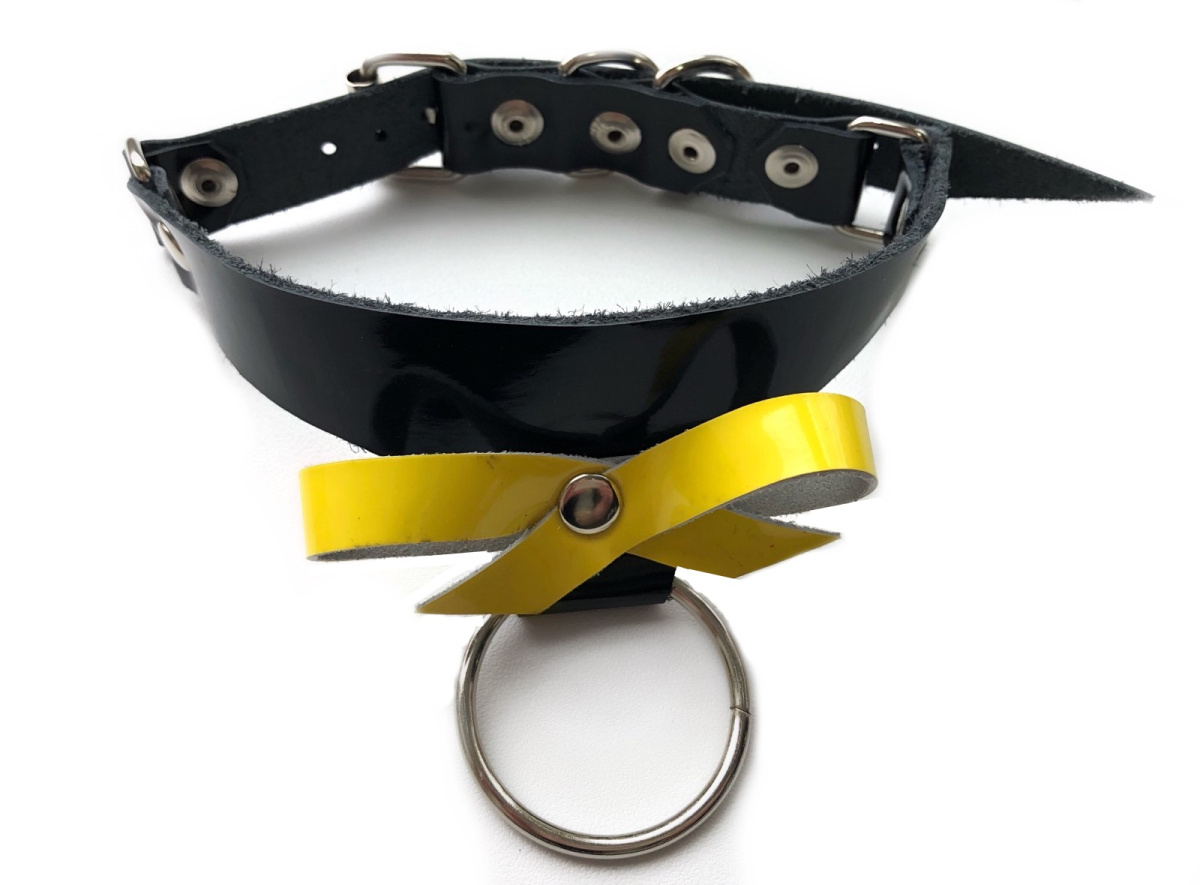 Изготовлен вручную из натуральной лаковой кожи черного цвета, декорирован металлическими заклепками, кольцом и милым бантом желтого цвета.