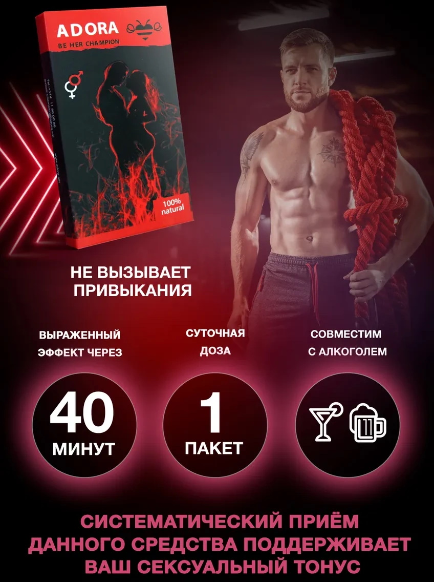 АДОРА применяется в качестве биологически активной добавки к пище при функциональных расстройствах сексуальной сферы (снижение полового влечения, ослабление эрекции, преждевременная эякуляция, фригидность у женщин); в целях общеукрепляющего воздействия на организм; дополнительного источника флавоноидов, дубильных веществ, витаминов В, С, D, Е, фолиевой кислоты, цинка, селена.