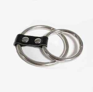 Комплект эрекционных колец на пенис из стали соединённых ремешком из искусственной кожи. 2 кольца разного диаметра.