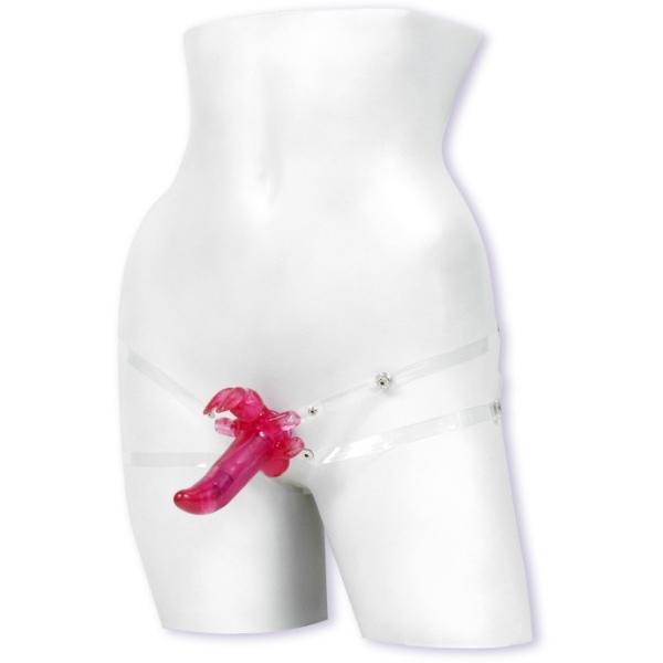 Массажер для G-точки из розового геля. Крепится на тело женщины на силиконовых ремешках-трусиках. Загнутый кончик вагинальной пробки воздействует на G-точку, длина стимулятора 11 см. Клиторальный стимулятор в виде зайчика, который своими ушками щекочет клитор. Стимулятор также может использоваться как страпон. Ремешки позволяют надеть игрушку на тело как вибро-пробкой внутрь, так и наружу. Игрушка водонепроницаема, батарейки в комплекте.