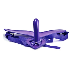 Комфортные трусики на фиолетовых ремешках с подушечкой в виде сердечка, к которой крепится металлическое кольцо, удерживающее фаллос.