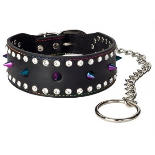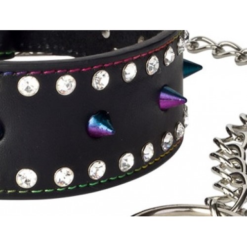 Оригинальный кожаный БДСМ ошейник с цветными шипами декорированный разноцветной нитью и стразами регулируется по объему при помощи ремня, расположенного сзади, так же имеется поводок цепочку с кольцом на конце для большего удобства.