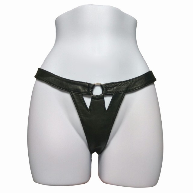 Черные сексуальные танга из натуральной кожи, декорированы металлическими кольцами спереди и на бедрах.
