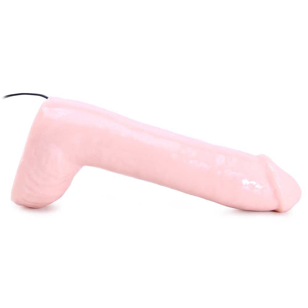 Классический вибромассажер из телесной термопластичной резины с мошонкой и выносным пультом управления вибрацией.