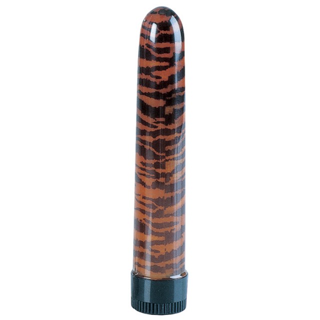 Пластиковый вибратор с тигровой окраской длиной 16,5 см и диаметром 3 см. Управление вибрацией встроенное.