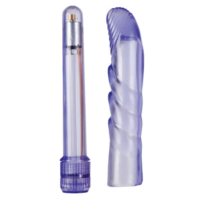 Тонкий пластиковый вибратор фиолетового цвета с мягкой насадкой в комплекте с загнутым кончиком.