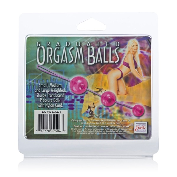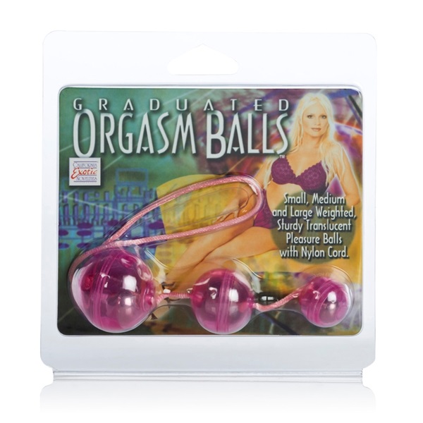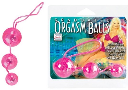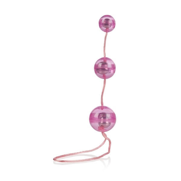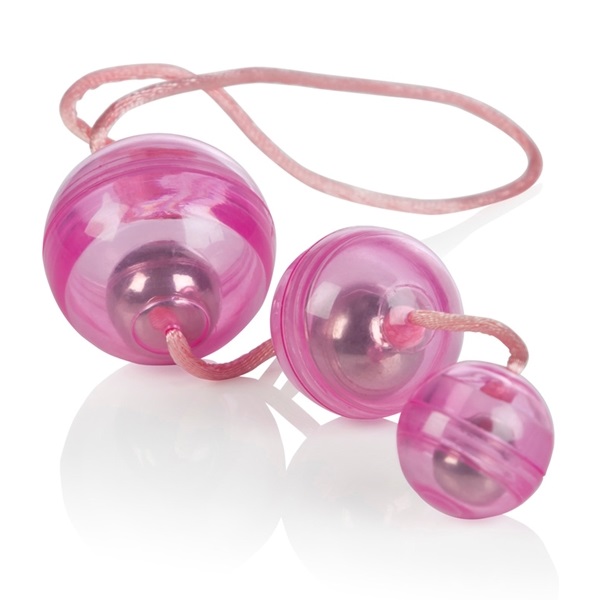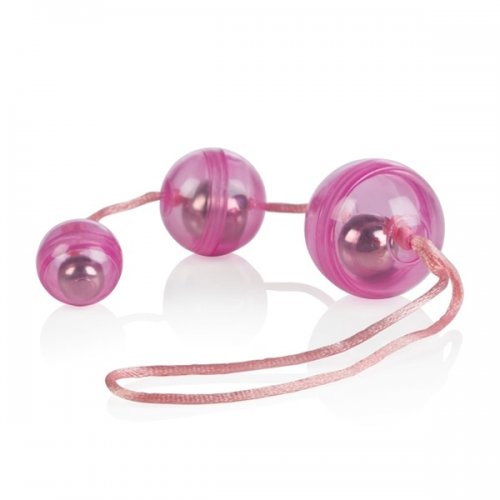 Три вагинальных шарика розового цвета со смещенным центром тяжести на веревочке из пластика.