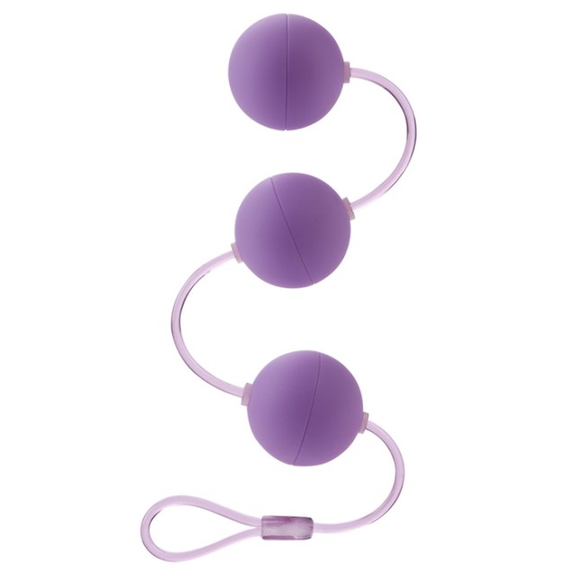 Гибкая гигиеничная нить с нанизанными тремя шариками из пластика. Каждый шарик со смещенным центром тяжести, все одинакового диаметра в 3 см. Длина всей нити вместе с петлей для извлечения 30 см. Вес шариков 67 граммов.