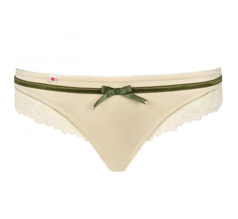 Ленточка с бантиком оливкового цвета оттенит нежный цвет трусиков, а кружевные проймы добавят больше нежности в образ.