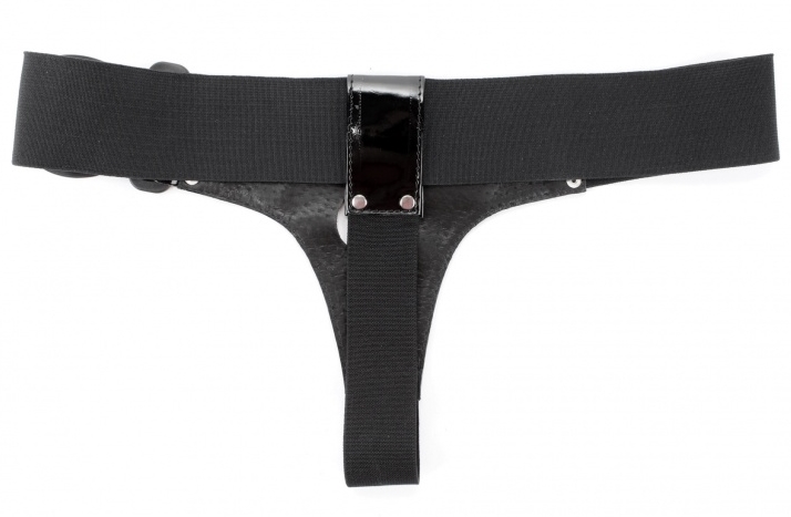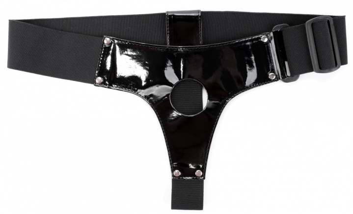 Трусики выполнены из лакированного кожзама черного цвета с элементами из черных эластичных резинок, надежно фиксирующих изделие на теле.