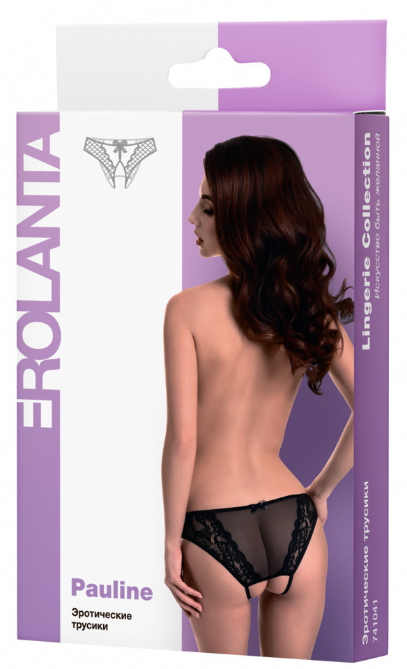 Эротические трусики Erolanta Pauline из стрейч-сетки, эластичные, с декоративным вырезом, с кружевными вставками, с атласным бантиком спереди.