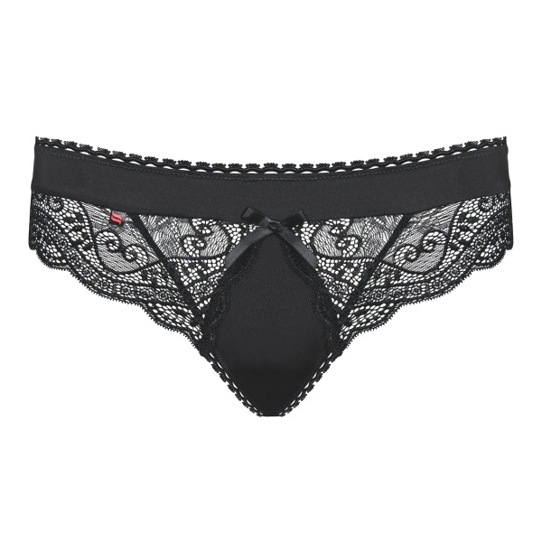 Трусики состоят из кружева и гладкого черного материала, спереди пришит маленький атласный бантик.