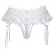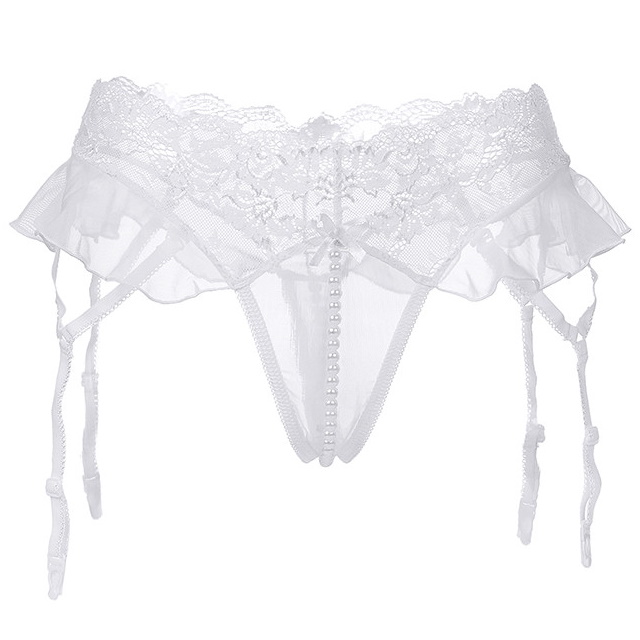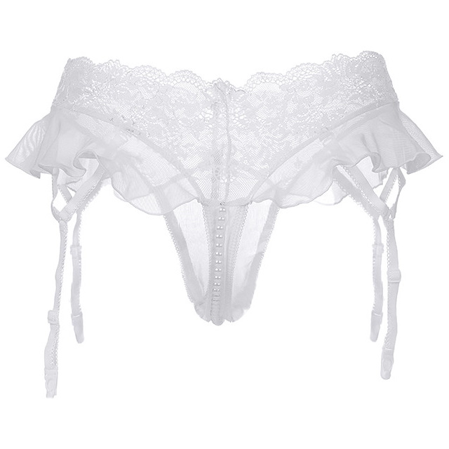Изысканный дуэт тонкой сетки и кружева с цветочным орнаментом украшает бедра, а игривые оборки делают их еще притягательнее. Жемчужная нить создает пикантный акцент на интимной зоне, пробуждая в мужчине первобытную тягу к завоеванию «сокровищ». Съемные регулируемые пажи позволяют экспериментировать с образами, добавляя к ним всевозможные чулочки.