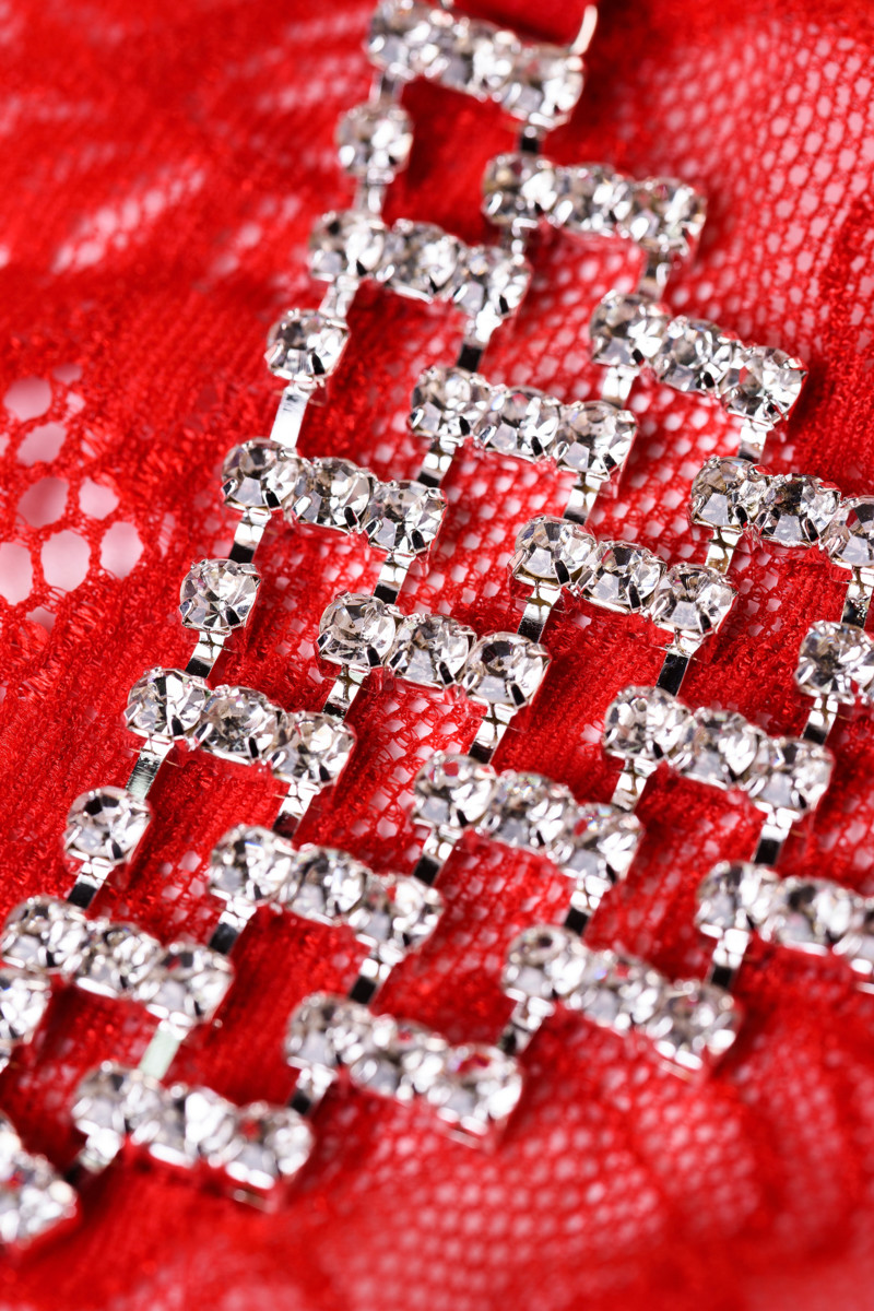 Полупрозрачное цветочное кружево впереди подчеркнет эротический настрой. Тонкие, мягкие лямочки и хлопковая ластовица обеспечат комфортные ощущения. Главный сюрприз - треугольная сеточка из страз на попе. Оригинальное колье, которое подчеркивает формы ваших ягодиц.
