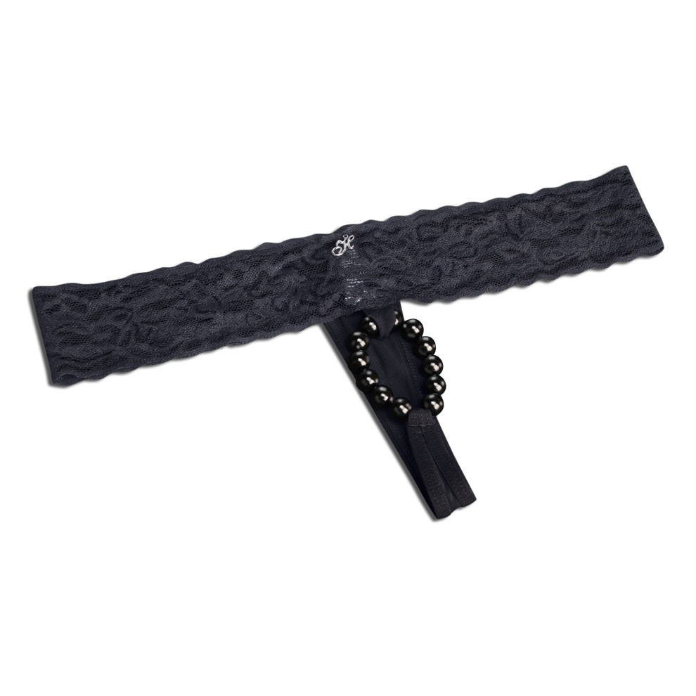 Трусики-тонг с открытой передней частью и стимулирующими 12-ми бусинками на резинке.