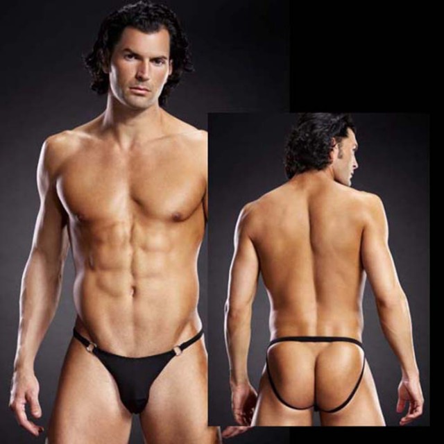 Сексуальные мужские трусы-джоки из черной микрофибры на тонкой резинке, декорированы металлическими кольцами по бокам.