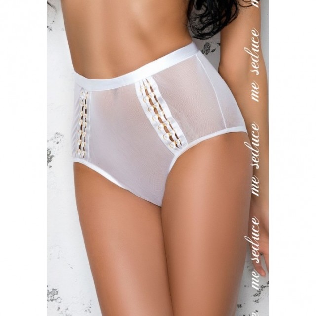 Трусики Ненасытная Глория с высокой талией выполнены из полупрозрачного белого материала и украшены оригинальными вставками.