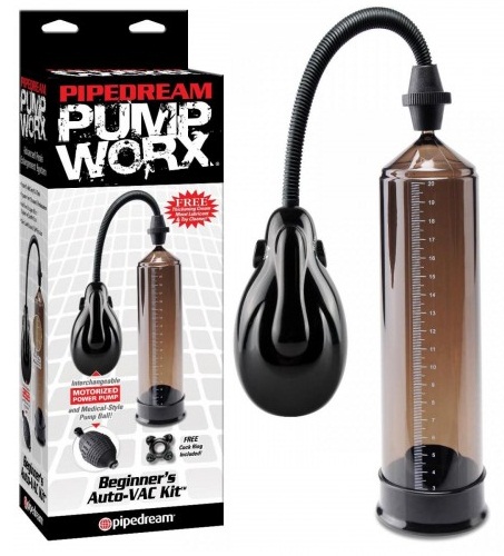 Комплектация: колба, насос-груша, автоматический насос работает от 3 батареек АА, эрекционное кольцо, смазка, очиститель и возбуждающий крем