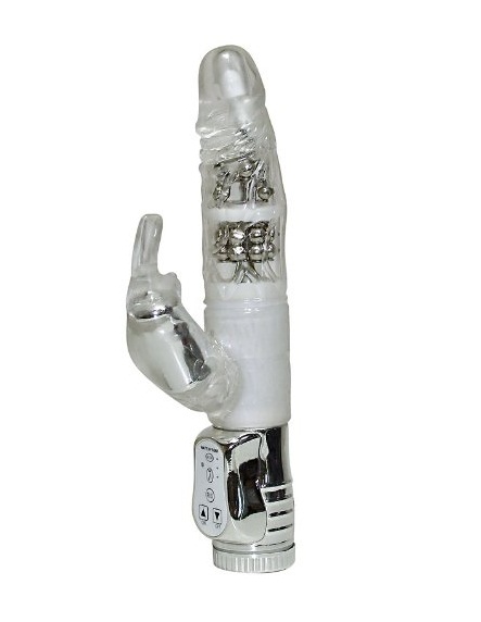 Прозрачный белый вибратор с вращающейся головкой и кроликом для стимуляции клитора.
