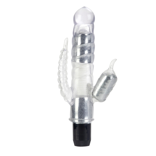 Мощный вибратор с тройной стимуляцией - клиторальной с помощью язычка, вагинальной (отросток с загнутой головкой длиной 13 см и диаметром 3,5 см) и тонкая анальная цепочка с шариками внутри (длина 8 см, диаметр от 1 до 2,5 см).Кристально чистый, мягкий вибратор с кнопкой быстрого выключения всех двух моторчиков.