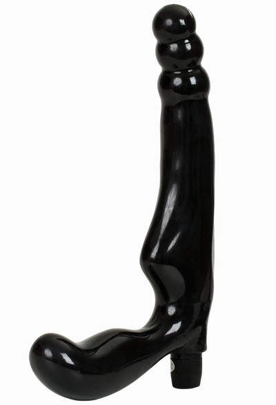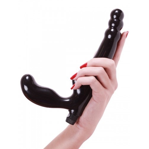 Черный вибратор-страпон из мягкого упругого TPR. Фаллос для анальной стимуляции, вагинальный стимулятор и выступ для массажа клитора.