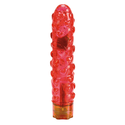 Красный силиконовый вибромассажер с сердечками и десятью!!! степенями вибрации и пульсации. Длиной 18 см и диаметром 4 см. Работает от двух пальчиковых батареек типа АА.