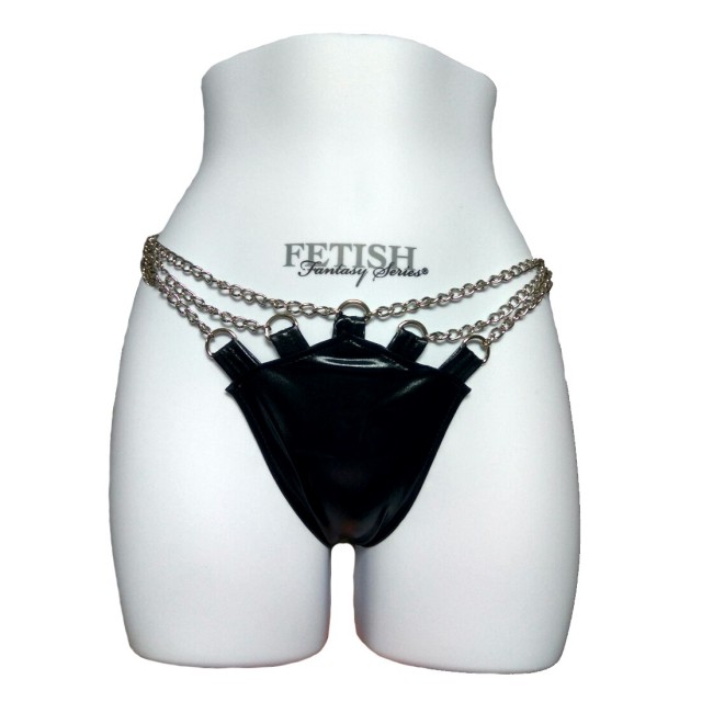 Порадуйте себя чувственным сочетанием черного винила и сияния металла! С этими эротичными трусиками Вы усилите акцент на своей сексуальности и придадите нотки агрессии своему облику. Изящные металлические цепочки издают тонкий звон при каждом вашем движении и привносят в образ легкий восточный колорит. Застежки классические, пряжки на ремешках с варьируемой длиной.