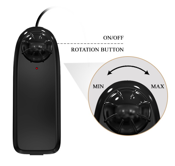 Ротация управляется при помощи выносного пульта управления - колесико плавно настраивает вибрацию от более легкой и нежной до более интенсивной и чувственной.