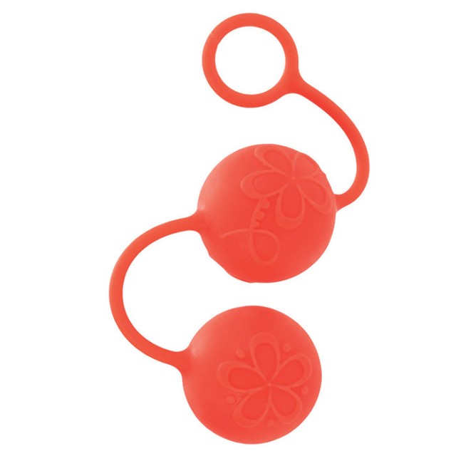 Яркие оранжевые вагинальные шарики со смещенным центром тяжести. На каждом шарике большой выпуклый цветок. Шары из пластика покрыты бархатистиым силиконом, соединяющая их нить также из гипоаллергенного силикона, колечко на конце поможет легко извлечь тренажер интимных мышц после использования. Диаметр каждого шарика 3,5 см. Вес двух шариков 83 грамма.