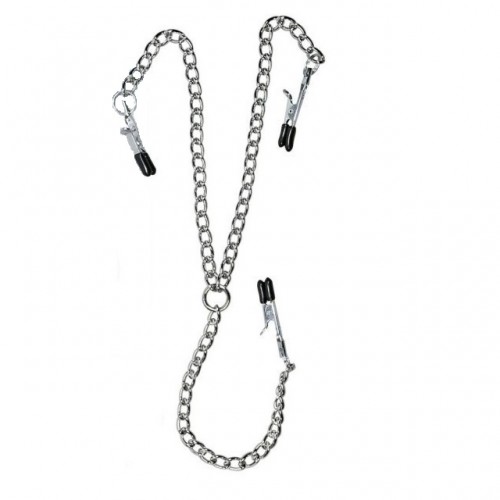 Серебристые зажимы на соски, соединенные цепочкой. Давление в зажимов регулирует специальный болтик сбоку, а силиконовые накладки на кончиках прищепок сделает использование более безопасным.