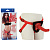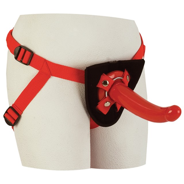 Универсальные трусики на красных ремешках с мягкой подушечкой, к которой крепится с помощью клепок металлическое кольцо, которое удерживает фаллос. Сам дилдо имеет загнутую форму для стимуляции точки G. Красный фаллоимитатор имеет длину 17,78 см, диаметр 3,5 см.