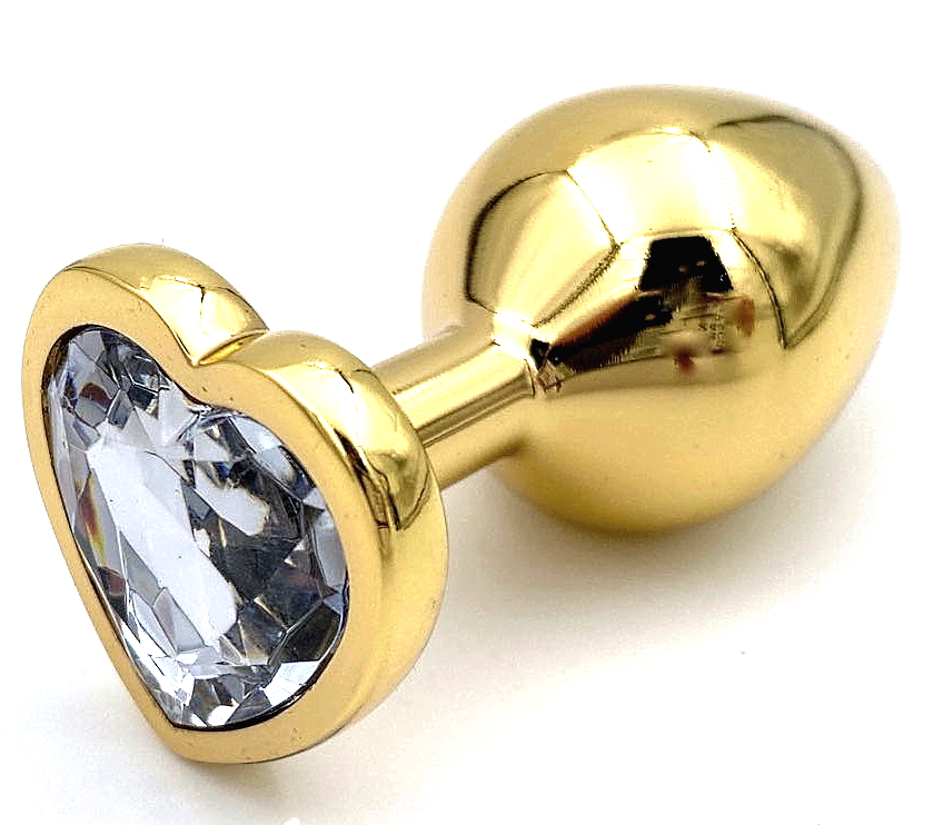 Золотой мини-плаг с прозрачным кристаллом-сердцем в основании.