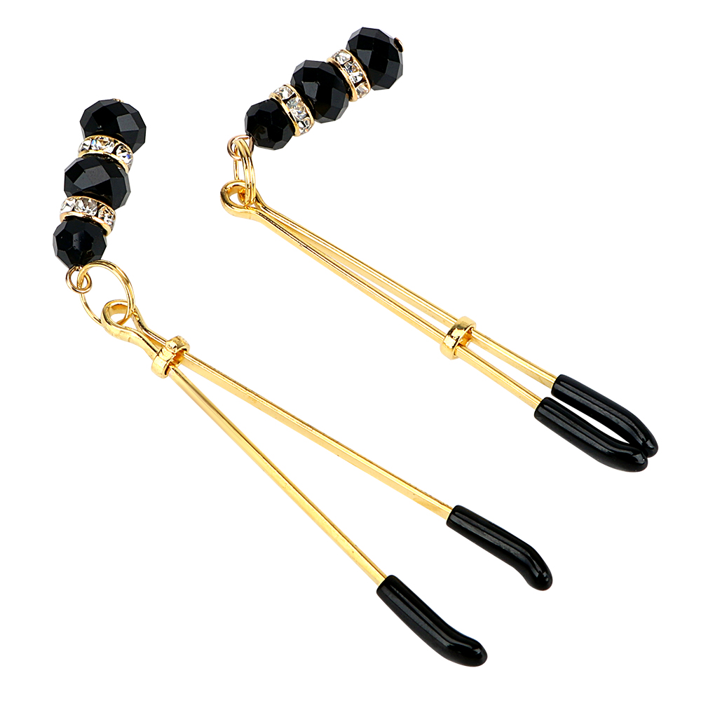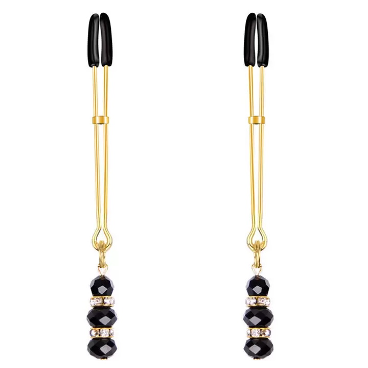 Металлические зажимы на соски, выполнены с бусинами на кончиках и имеют специальные мягкие наконечники, оберегающие нежную кожу сосков от повреждения. Сила сжатия регулируется специальным ползунком.