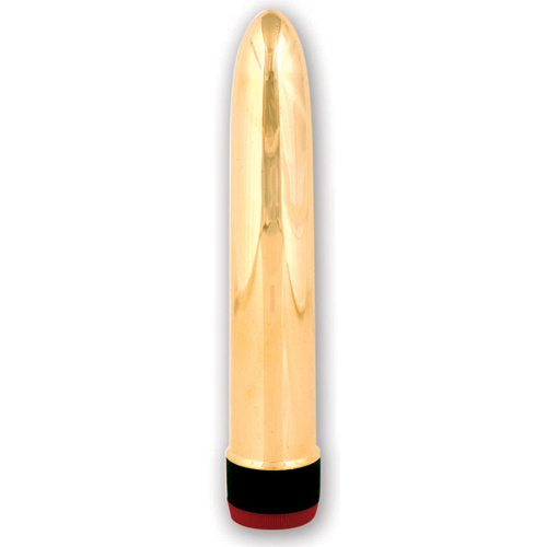 Золотой вибратор длиной 16,5 см и диаметром 3 см из пластика.